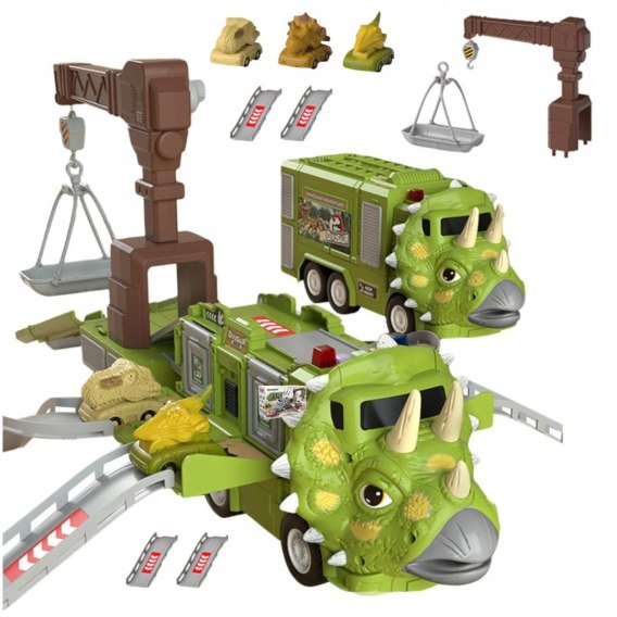 Jeśli Twoje dziecko uwielbia zarówno dinozaury, jak i pojazdy, to Ciężarówka Dinozaur Triceratops z Tirem, Lawetą i Dźwigiem będzie strzałem w dziesiątkę! Ta zabawka łączy pasję do prehistorycznych zwierząt z fascynacją samochodami, oferując wiele godzin radosnej zabawy. Zawiera wszystko, czego potrzeba do stworzenia niesamowitych scenek: otwieraną naczepę, zjeżdżalnie, dźwig oraz trzy małe autka w kształcie głów dinozaurów, które zapewnią maluchowi ogromną frajdę!