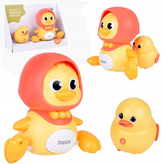 Zestaw zawiera jedną dużą kaczuszkę - mamę i małe kaczątko. Dzięki muzyce, efektom świetlnym i różnym trybom zabawy, kaczuszka wspiera rozwój dziecka, zachęca do raczkowania i aktywności ruchowej, jednocześnie dostarczając mnóstwo radości.