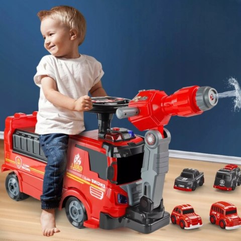 Ten jeździk to prawdziwa niespodzianka - po uniesieniu siedziska zamienia się w funkcjonalny parking z dwiema rampami zjazdowymi. Dołączone pojazdy mogą z nich swobodnie zjeżdżać, tworząc mini plac budowy pełen ruchu, emocji i kreatywnej zabawy.