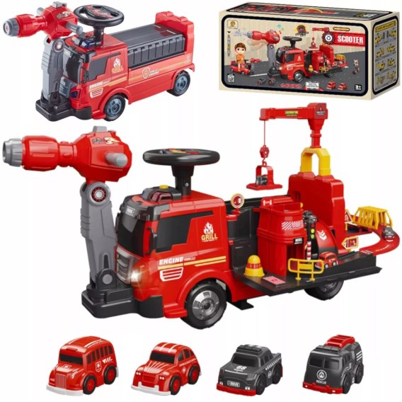Ten jeździk to prawdziwa niespodzianka - po uniesieniu siedziska zamienia się w funkcjonalny parking z dwiema rampami zjazdowymi. Dołączone pojazdy mogą z nich swobodnie zjeżdżać, tworząc mini plac budowy pełen ruchu, emocji i kreatywnej zabawy.