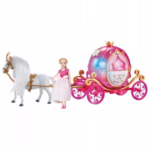 Dzięki tej zabawce Twoje dziecko wcieli się w rolę księżniczki podróżującej zaczarowaną karocą po bajkowej krainie. Lalka z blond włosami, ubrana w różową sukienkę i buciki, zasiada w eleganckiej karecie zaprzężonej w chodzącego białego konia z dźwiękiem i światłem. Kareta posiada otwierane drzwi po obu stronach oraz piękne złote zdobienia, które dodają jej królewskiego stylu.