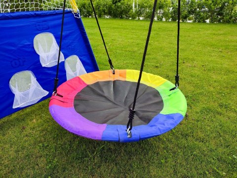 W zestawie: huśtawka pojedyncza, huśtawka bocianie gniazdo, kosz do koszykówki z piłką, mata celnościową z piłką do piłki nożnej, pompka, kompletny zestaw montażowy, siatki zabezpieczające, szpilki mocujące, czytelna instrukcja w języku polskim.