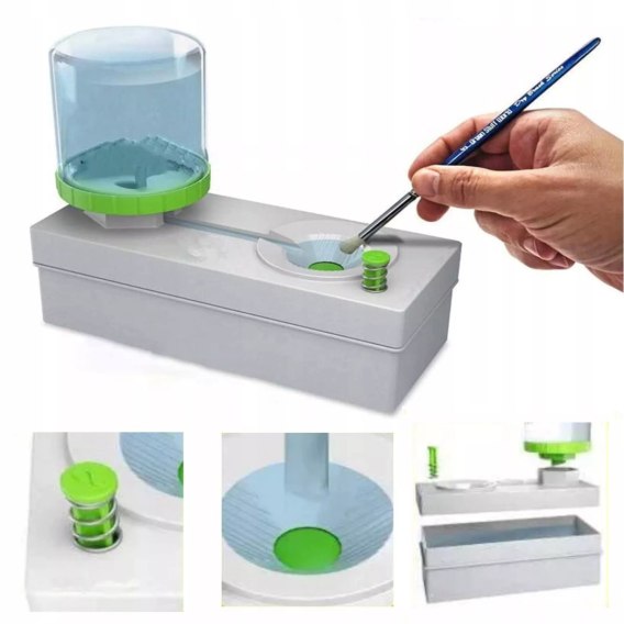Płuczka do pędzli to idealny sposób na łatwe i szybkie czyszczenie pędzli podczas malowania. Nie ma potrzeby ciągłego wymieniania wody w kubku lub posiadania kliku kubków do płukania pędzli na biurku. Wystarczy napełnić zbiorniczek wodą, wyczyścić pędzel w zagłębieniu i nacisnąć przycisk, dzięki któremu brudna woda spłynie, a pojawi się czysta.