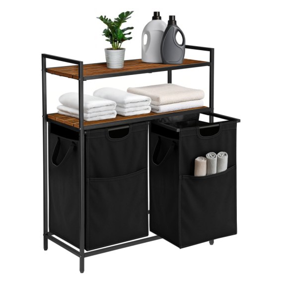 Regał na pranie z półkami MIRUN – 2 komory, czarny / postarzany dąb – II GATUNEK