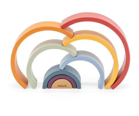 Zabawa polega na ułożeniu 7 kolorowych łuków wraz z półokrągłym klockiem w tęczę lub w inną, dowolną konstrukcję. Układanka posłuży początkowo dla najmłodszych jako zabawka, która rozwinie koordynację ręka-oko, zdolność logicznego myślenia i rozpoznawania kolorów. Pozwoli na radosną zabawę zarówno samodzielnie jak i w większym gronie. Gdy nasz Maluszek stanie się Smykiem, posłuży jako gra ucząca: praw fizyki, zarządzania, zabawy w grupie oraz radzenia sobie z niepowodzeniami. Dodatkowo, dziecko będzie rozwijało swoją: wyobraźnie, kreatywność, motorykę oraz sensorykę i jak również myślenie przestrzenne. Całość wykonana została z drewna bukowego i pomalowana nietoksycznymi farbami o stonowanych barwach, które przyciągną wzrok oraz zachęcą do zabawy dając jednocześnie mnóstwo radości z zabawy.