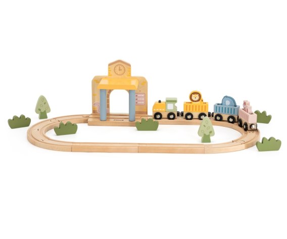 Zawartość zestawu: tory, stacja kolejowa z dźwiękiem, lokomotywa, 3 wagony, figurki zwierząt (lew, słoń, lis), drzewa i krzewy