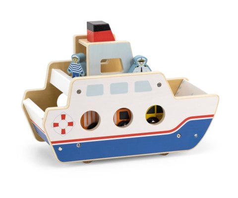 Zestaw Drewniany Prom Samochodowy zachwyca estetycznym i kolorowym designem, który przyciąga uwagę dzieci. Wygląda jak prawdziwy prom przewożący samochody. Posiada ruchome elementy takie jak przednia i tylna rampa, którymi można manipulować, wzbogacając zabawkę o funkcje interaktywne co angażuje dzieci w zabawę. Prom wyposażony jest również w kółka ułatwiające przemieszczanie. Do zestawu dołączone są drewniane figurki kapitana i marynarza oraz 4 samochodziki.
