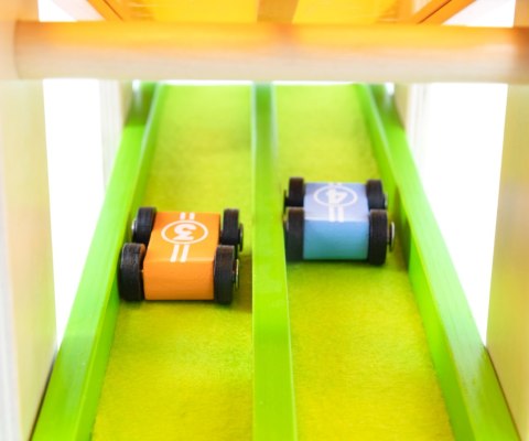 Na miejsca! Gotowi! Start! Tor wyścigowy dla samochodów od firmy Viga to jeden z najwspanialszych zabawek, która będzie służyła długo i zapewni Twojemu dziecku dużo ciekawej i kreatywnej zabawy. Ten kolorowy tor do wyścigów przeniesie dziecko w świat szybkich aut. Wspaniała zabawa rozpocznie się, gdy samochody ruszą z linii startu. Które autko dojedzie pierwsze? Każdy z 4 podwójnych torów jest wykonany z innego tworzywa: niebieski- jak jezioro z lustrzaną powłoką, żółty panel akrylowy jako preria, zielony- filcowy jako łąka i czerwony- drewniany jako tor wyścigowy. Dzięki czemu dzieci mogą obserwować jaki jest odgłos i prędkość auta na poszczególnej nawierzchni. Na górze znajduje się przekręcana blokada służąca do startowania autek a na mecie zawieszone są dzwoneczki, dzięki którym będzie wiadomo czyje autko dojechało pierwsze. To świetna okazja by wspólnie spędzić czas z dzieckiem i poznać w praktyce niektóre prawa fizyki.
