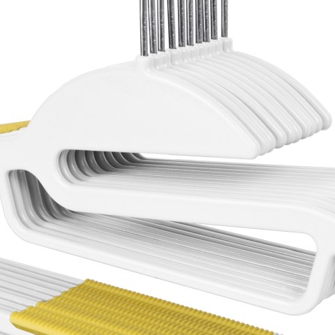 Oferujemy elastyczne i mocne wieszaki plastikowe idealne do szafy, garderoby czy też ekspozycji odzieży w butiku. Wieszaki wykonano z mocnego i wytrzymałego tworzywa sztucznego. Żółte, gumowe elementy zapobiegają zsuwaniu się ubrań, a odpowiednie wyprofilowanie sprawia, że tkaniny nie ulegają deformacji. Wieszaki posiadają metalowy, chromowany haczyk. Wieszak posiada wcięcia ułatwiające zakładanie odzieży. Dzięki temu odzież się nie rozciąga i nie deformuje.
