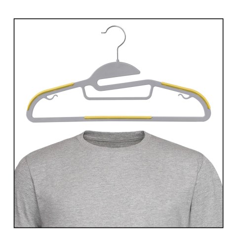 Oferujemy elastyczne i mocne wieszaki plastikowe idealne do szafy, garderoby czy też ekspozycji odzieży w butiku. Wieszaki wykonano z mocnego i wytrzymałego tworzywa sztucznego. Żółte, gumowe elementy zapobiegają zsuwaniu się ubrań, a odpowiednie wyprofilowanie sprawia, że tkaniny nie ulegają deformacji. Wieszaki posiadają metalowy, chromowany haczyk. Wieszak posiada wcięcia ułatwiające zakładanie odzieży. Dzięki temu odzież się nie rozciąga i nie deformuje.