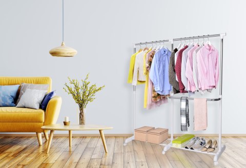 Wieszak stojący Rufo biały to eleganckie i praktyczne rozwiązanie do przechowywania ubrań, które sprawdzi się zarówno w przestrzeni domowej, jak i biurowej. Wyposażony w możliwość regulacji wysokości oraz szerokości, pozwala dopasować go do indywidualnych potrzeb. Solidna, stalowa konstrukcja zapewnia stabilność i trwałość użytkowania przez długie lata. Mobilne kółka ułatwiają przesuwanie wieszaka w dowolne miejsce, a dodatkowa półka na obuwie pomaga utrzymać ład i porządek w garderobie. To funkcjonalny mebel, który oszczędza miejsce, organizuje przestrzeń i dba o Twoją odzież.
