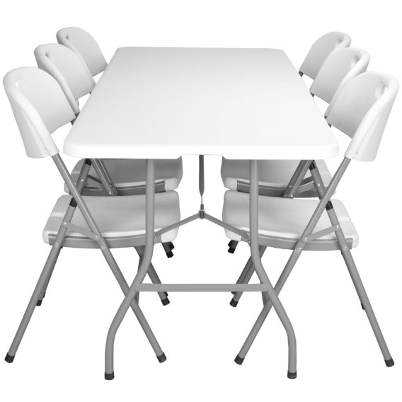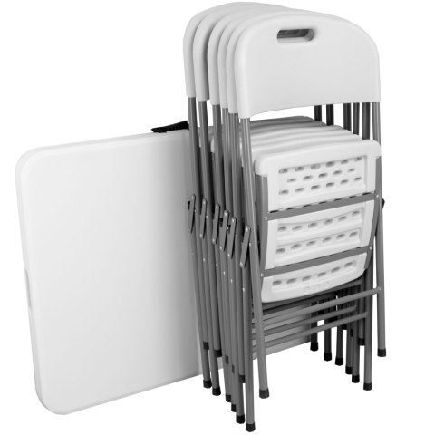 Zestaw cateringowy, w skład którego wchodzi składany stół o długości 180 cm oraz 6 składanych krzeseł, doskonale nadaje się na różne wydarzenia. Solidność zapewnia konstrukcja ze stali pokrytej powłoką proszkową, a wytrzymałe tworzywo HDPE, z którego wykonano blat i siedziska, gwarantuje odporność na zniszczenia. Zarówno stół, jak i krzesła są wygodne w przenoszeniu - stół ma praktyczny uchwyt, a krzesła otwór w oparciu, co ułatwia ich transport. Całość jest odporna na warunki atmosferyczne, a antypoślizgowe stopki na nogach zapewniają stabilność zestawu.